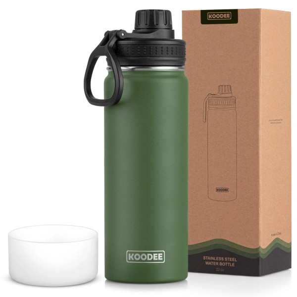 koodee Insulated Water Bottle, 22 oz Stainless Steel Double Wall Vacuum Wide Mouth Sport Bottle with Leakproof Spout Lid(Grass Green)