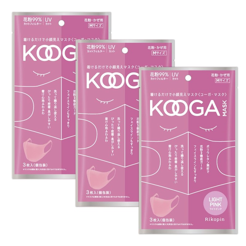 KOOGAMASK 3-Piece Set, Individual Packaging, Small Face, Washable, Pollen Urethane, UV Protection, Medium Size, Light Pink