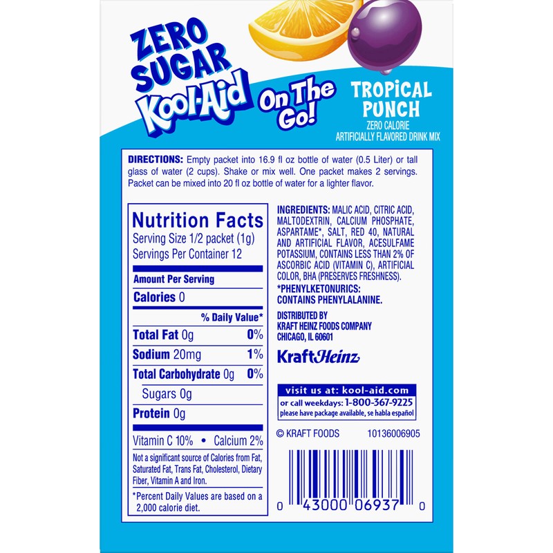 Single-Serving Tropical Punch - The Kool-Aid On The Go Sugar Free Tropical Punch Powdered Soft Drink is a new and improved flavor of citrusy goodness that is sugar free and rich in vitamin C. The perfect blend of natural flavors and tasty artificial ingredients offers outrageous and delicious flavor for people of all ages. A Tropical Vacation for Your Taste Buds - This invigorating, low-calorie tropical punch is both a healthy and refreshing choice for kids and adults alike. This pack contains 6 single-serving pouches, allowing you to make 12 servings of this delicious summer beverage. Not only is it healthy, but the citrusy flavor will make you feel like you're in a tropical paradise.
