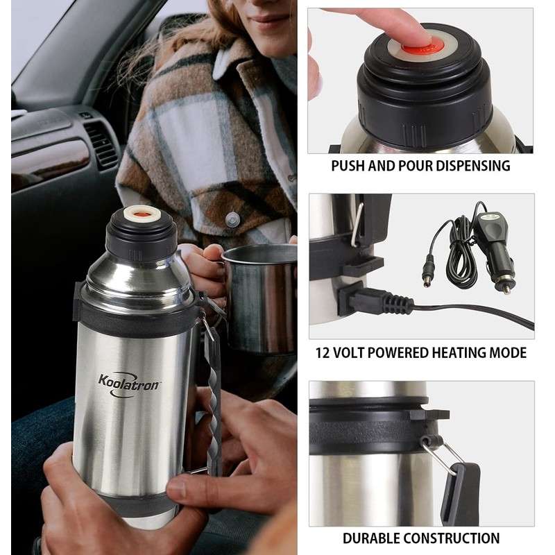 Koolatron 12V Insulated Vacuum Flask with Heater, 1L Silver and Black Stainless Steel, Push Button Dispenser, for Car, SUV, Truck, RV, Boat