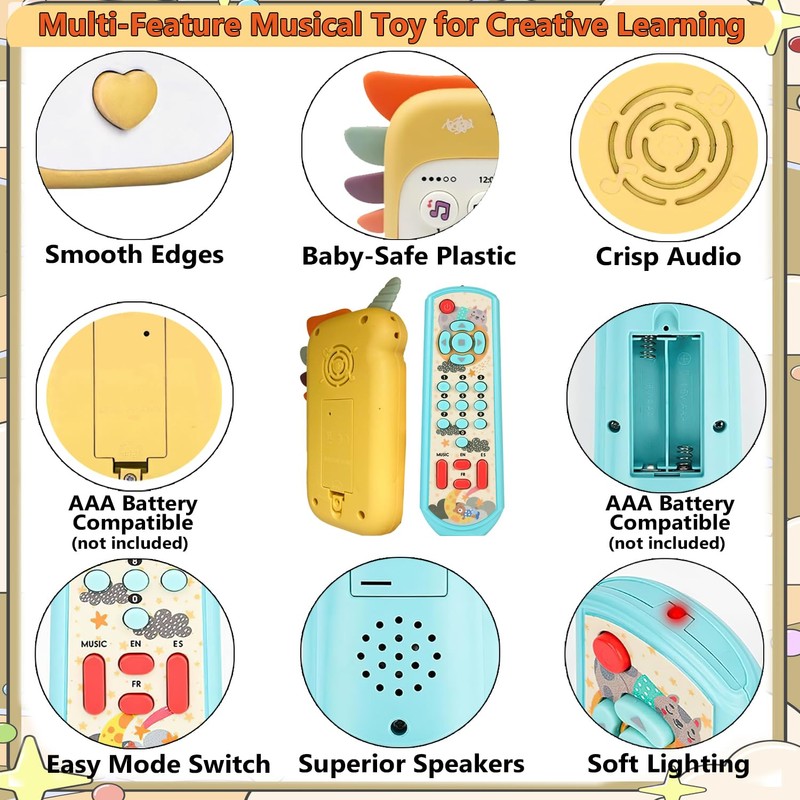 - Educational Play Modes: The remote provides basic vocabulary in English, Spanish, and French, while the phone offers animal sounds, musical tunes, and weather effects. These modes promote early language development.