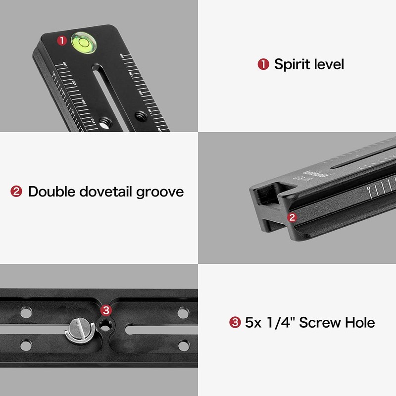 - ★ Multi-purpose quick release plate rail, high-quality aluminium alloy is used to ensure lightweight but super strong support. With precise scale and spirit level, ideal for macro photography.