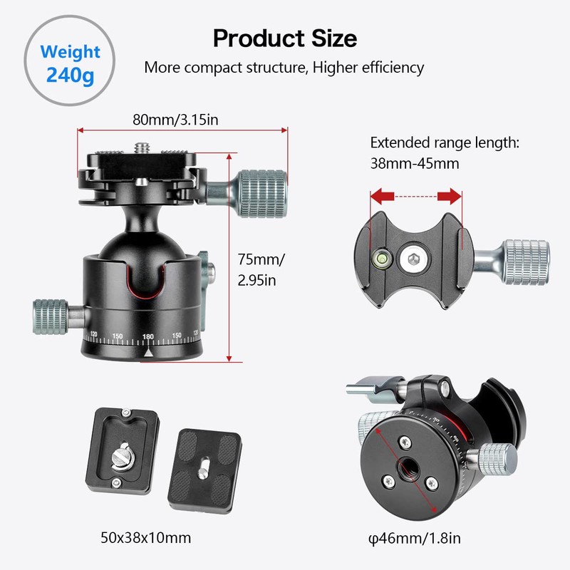 - Wide compatibility: the ball head can be used with tripods, monopods and camera sliders to install cameras, DVs, mobile phones and telescopes. 1/4 inch screw quick release plate screw and 3/8 inch thread tripod mounting screw. Quick release board compatible with Acra RR etc.