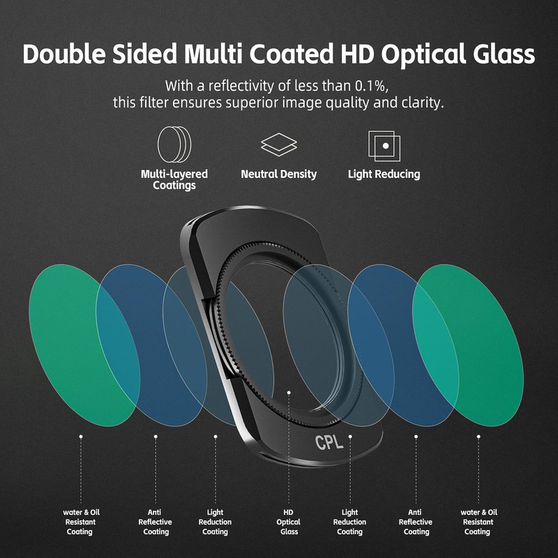 - 【Multi Coated HD Optical Glass】 With multiple layer coatings on both sides of the HD optical glass, these handheld action camera filters are water repellent, scratch resistant, and oil proof, ensuring long lasting optical quality in challenging environments.