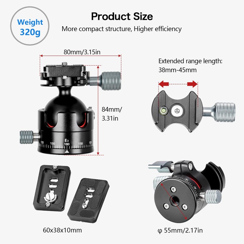 - Stable low profile: the ball head is designed with a low centre of gravity and a large ball diameter of Φ45 mm, making it extremely stable. The design with two U-shaped notches allows you to easily switch from horizontal rotation to vertical recording for panoramic shots.