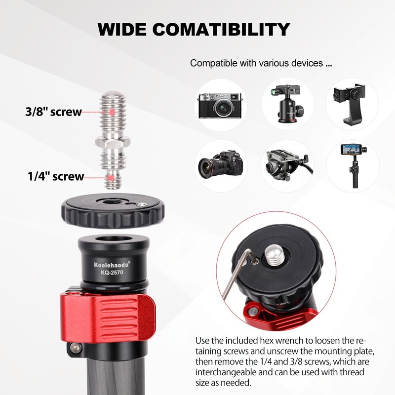- 【Wide Compatibility】Universal Mounting Plate with Reversible 1/4" & 3/8" screw allows mounting of virtually any camera, camcorder, ball head, webcam, microphone, phone holder, monitor, gimbal stabilizers etc. with 3/8” screw hole at the bottom,Include one 1/4" to 3/8" Bushing Adapters, it can be attached with tripods for additional height.