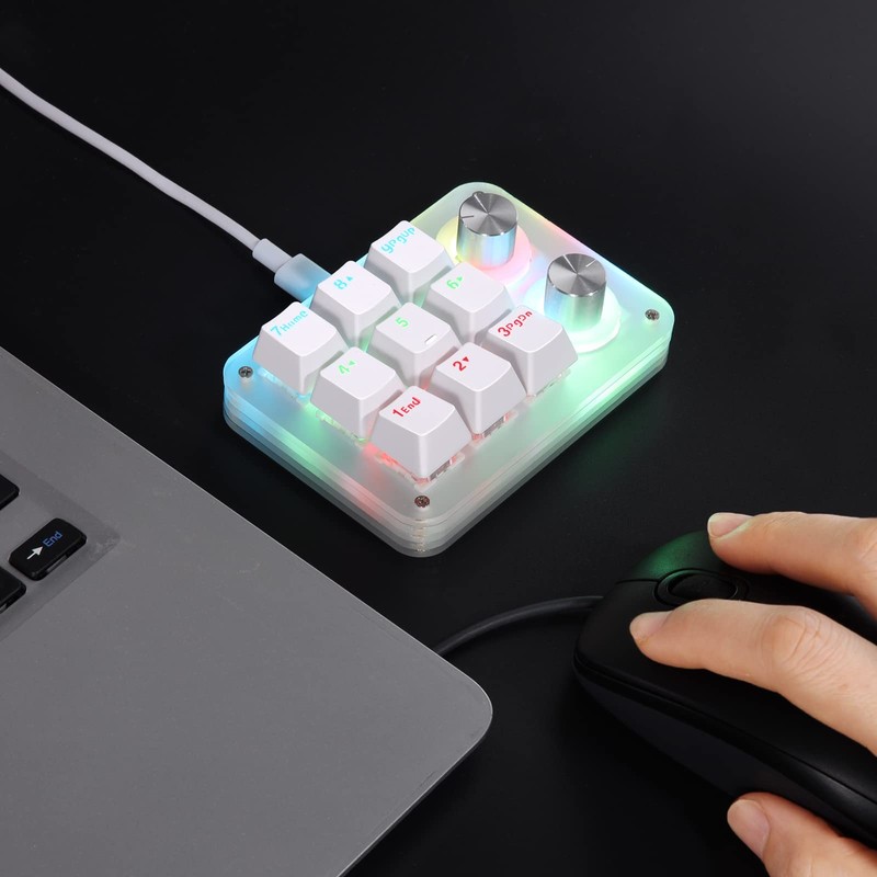 - 【One Handed Mini Keyboard】Nice quality. Small and portable mini keyboard with unique knob is perfect for making work faster, plays games smoothly etc. The knob (rotate left and right, press down) also can be programmed. Rotate left and right can be infinitely rotated, can be set to ± volume, switch music previous/next, decrease/increase light brightness, switch light mode, turn pages forward/backward etc. you can carry it with you, effectively saving desktop space.