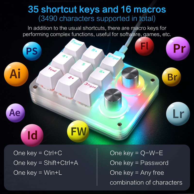 - 【Keyboard with Macro Keys】There are 16 buttons for advanced macro functions. Macro functions can be used in tandem and can support up to 349 key commands. Delayed commands can be added to meet various complex use cases such as: Office, CAD/Ae/Pr/Ps shortcuts, various user accounts and passwords, game tricks, basic codes for programmers. For example, the Set button will trigger a series of actions such as "Ctrl + A 0.5s Ctrl + C 0.5s Ctrl + V", etc.