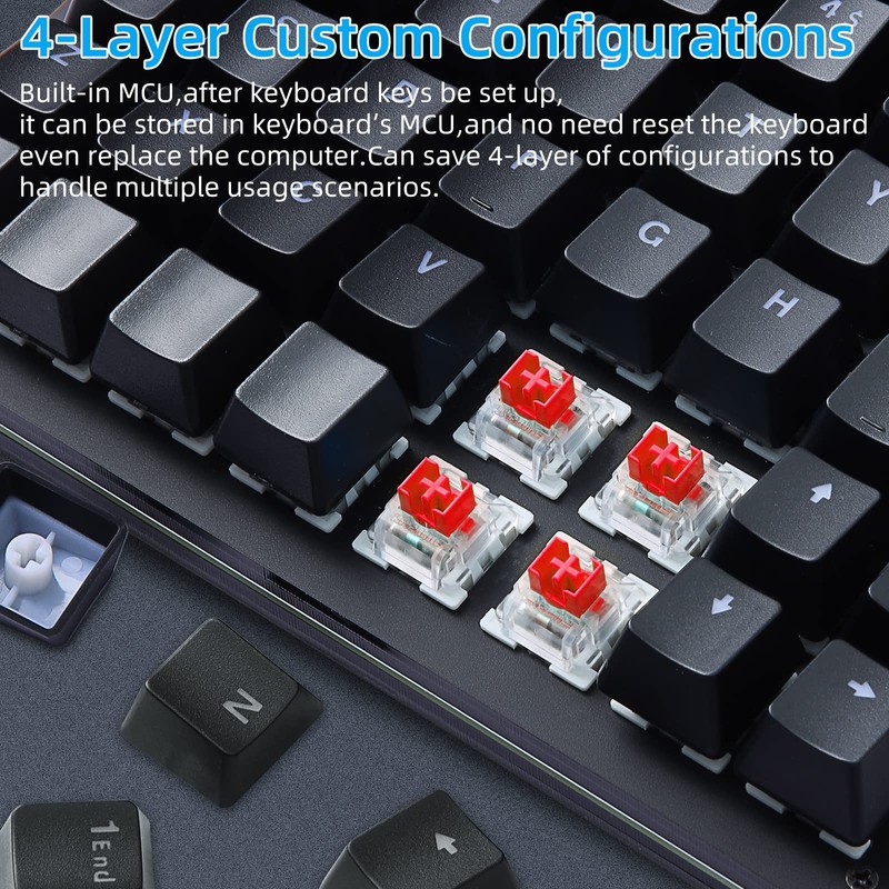 - 4 Layers of Custom Configurations: Built-in MCU, after setting the keyboard keys, they can be stored in the keyboard's MCU without resetting the keyboard. 4 layers of configurations can be saved to handle multiple use cases. Not only for gamers, but also for many other types of users, including designers and video editors 4-Layer Custom Configuration: Built-in MCU that stores keyboard keys in the keyboard's MCU after they have been set up, without having to reset the keyboard or even change computers. Four layers of configurations can be saved to handle multiple use cases. Not only for gamers, but also for many other types of users, including designers and video editors