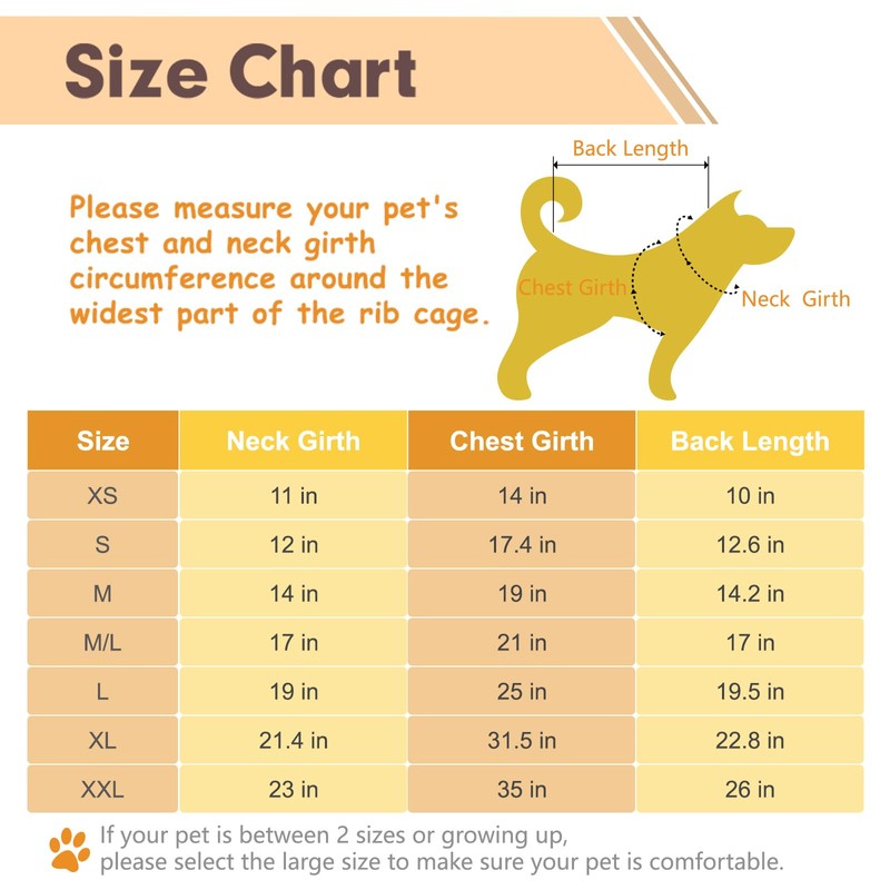 - Size Medium/Large: Neck girth 17"; Chest girth 21"; Back length 17". We recommend that use our size chart for more fit and comfortable, measure your dog's size then choose the size your pet needs.