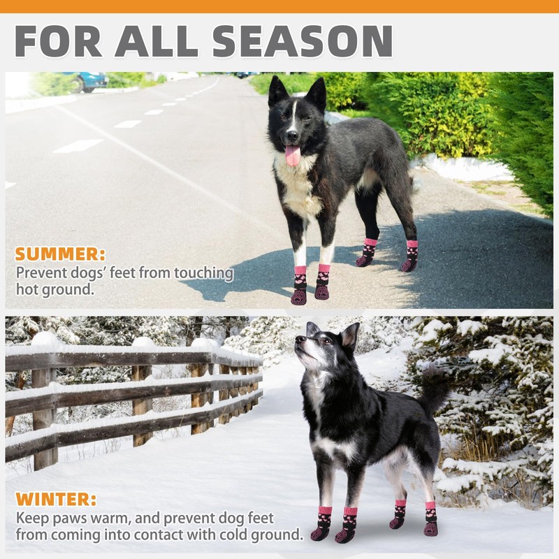 • MULTIFUNCTIONAL PAW PROTECTORS: Our anti-slip dog socks prevents your dog from licking wounds, from getting burned on the hot pavement outdoor in summer, and from getting frostbite in the cold winter. It also has strong grip to prevent slipping on indoor floors. In addition, it prevents naughty dogs from scratching the sofa and floor. Compared to dog boots, dog shoes have a softer bottom and are more comfortable to wear.