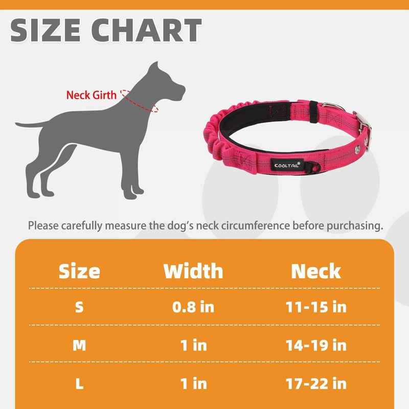 - 3 SIZES CHOOSE: Size S neck girth is 11-15 in; Size M neck girth is 14-19 in; Size L neck girth is 17-22 in. Please follow the size chart to measure your dog's neck carefully before you place the order to ensure the collar is fit well to your dog. Don't choose sizes solely based on weight and breeds. The dog collar should be comfortable enough to place two fingers between the dog's neck and collar.