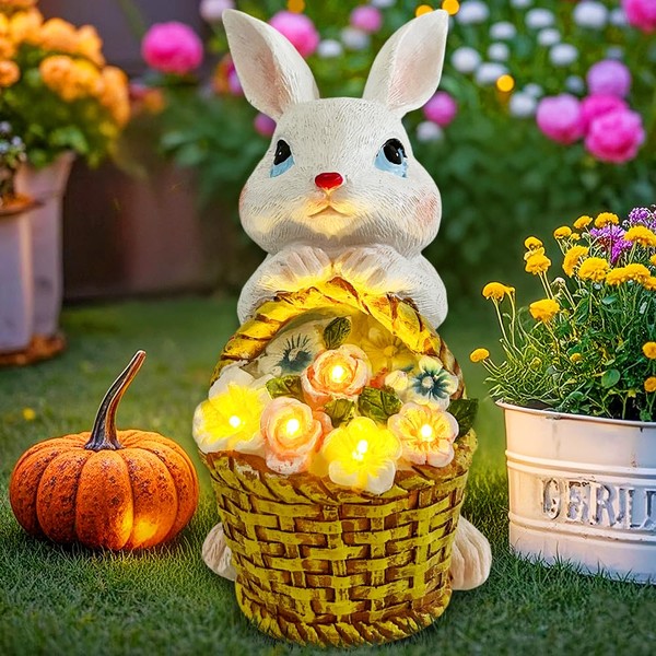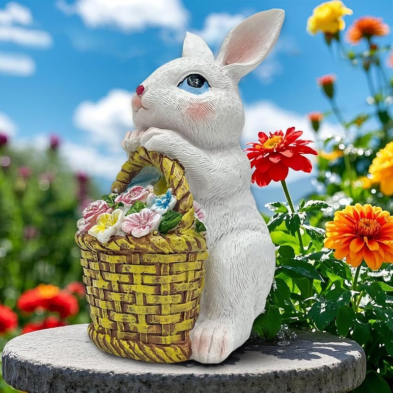 - Unique Garden Decor : Garden bunny statue's two little paws are raised holding flowers in an irresistibly adorable and mischievous pose, always ready to put a smile on anyone's face. This rabbit figurine is hand-painted with very nice details and good workmanship. It is a decor in the garden, patio, backyard, pond,lawn,yard, front porch or anywhere in your yard to add fun and playfulness.