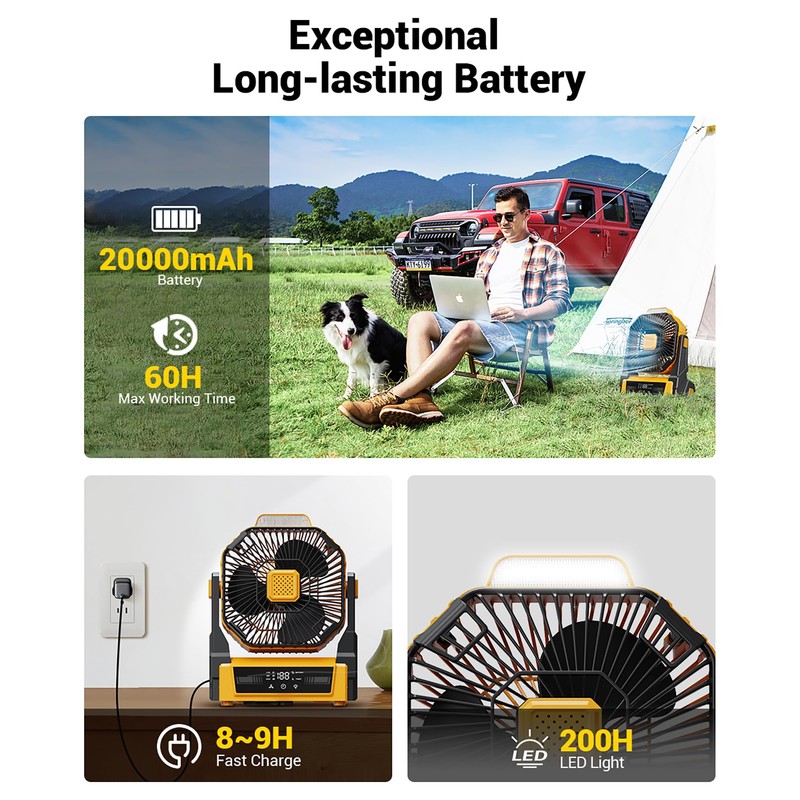 - Fast Charging & Saving TimeThat's right! The batteries can be fully charged in as little as 8~9 hours, which is relatively fast than other outdoor tent fan. You will enjoy up to 60 hrs or more if your battery is fully charged. This camping gear is especially useful when you're away from a power source for an extended period and need to rely on the fan to keep you cool.