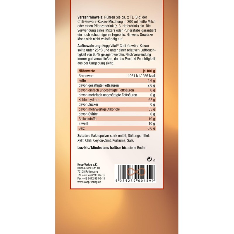 Storage: Kopp Vital chili spice cocoa should be stored below 25°C and under a relative humidity of 60%. Always close well after use, as the product draws moisture from the environment.