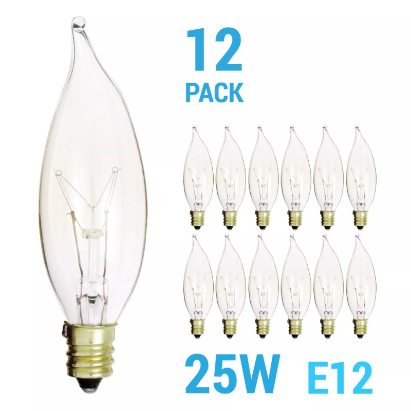 KOR 12 Pack 25CFC Chandelier Bulbs 25W Watt 120V CA8 Flame Tip Candelabra E12 Clear