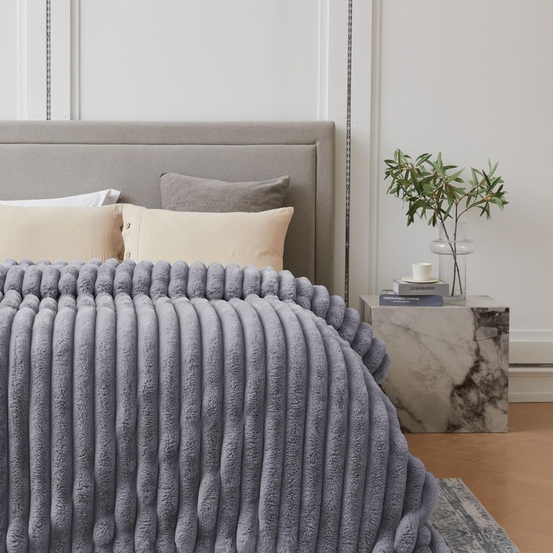 KORBLISS Faux Fur Throw Blanket for Couch, Cozy Warm Plush Striped Blanket for Sofa Bedroom Living Room, 50x60 Inches Grey