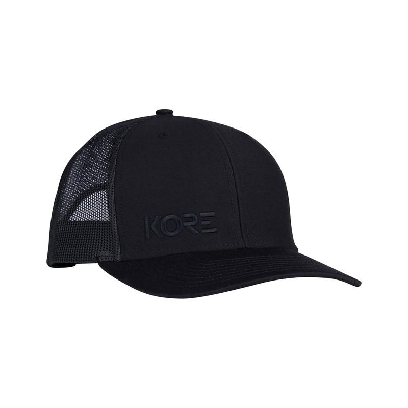 Baseball Trucker hats feature 2 black cotton twill front panels and a pre-curved visor (2.75” length). Four black mesh back panels provide open circulation for breath-ability. Kore logo is fully embroidered for style and durability.