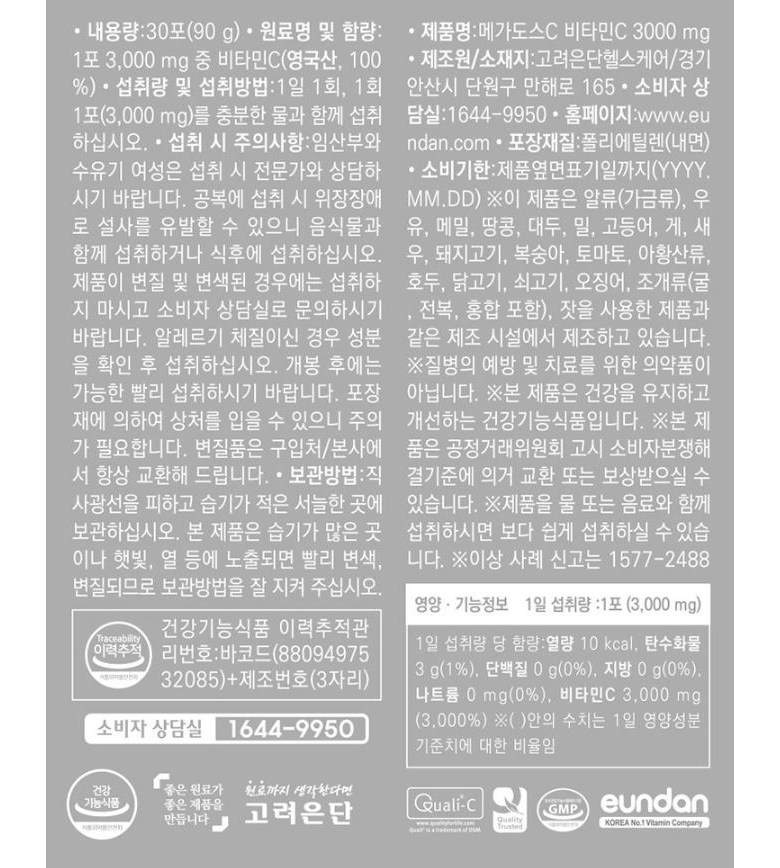 Korea Eundan Megadose C 3000 Vitamin C 3000mg high-content vitamin, 1 piece, 60 packs / 고려은단 메가도스C 3000 비타민C 3000mg 고함량 비타민, 1개, 60포