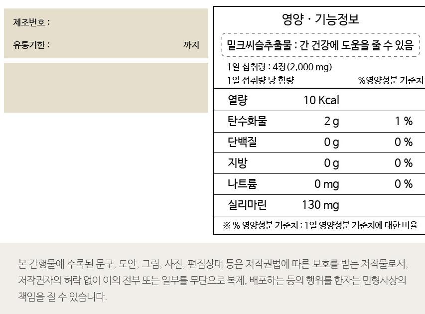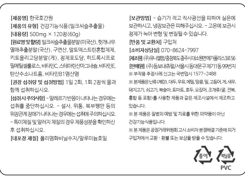 Korea Nursing Center 500mg x 120 tablets (Milk Thistle Liver Health Nutrient), 120 tablets / 한국호간원 500mg x 120정 (밀크씨슬 헛개 간건강 영양제), 120정