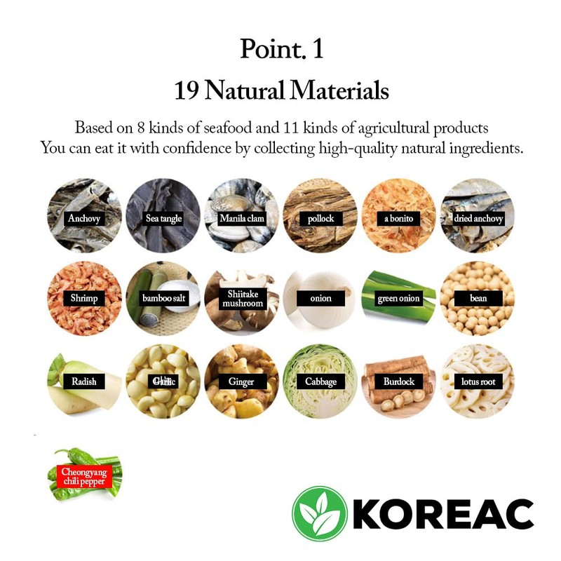 • Mild yet Spicy Flavor A combination of 18 base ingredients with added Cheongyang chili peppers for a spicy kick. * Key Ingredients: Kelp, clam, anchovy, bonito, shiitake mushroom, bamboo salt, Cheongyang chili pepper, radish, ginger, and more.