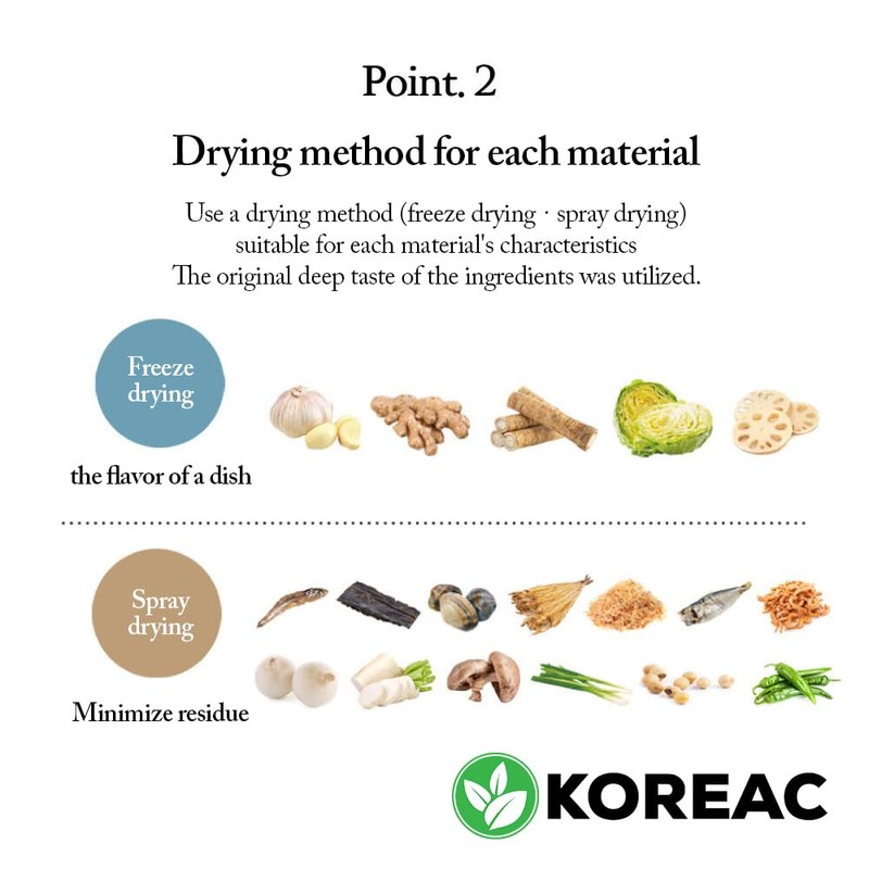• Drying Methods for Each Ingredient * Freeze-Dried: To preserve flavor, garlic, ginger, burdock, cabbage, and lotus root are freeze-dried. * Spray-Dried: To minimize residue, anchovy, kelp, clam, pollock, bonito, onion, radish, shiitake mushroom, shrimp, sand lance, green onion, soybean, and Cheongyang chili pepper are spray-dried.