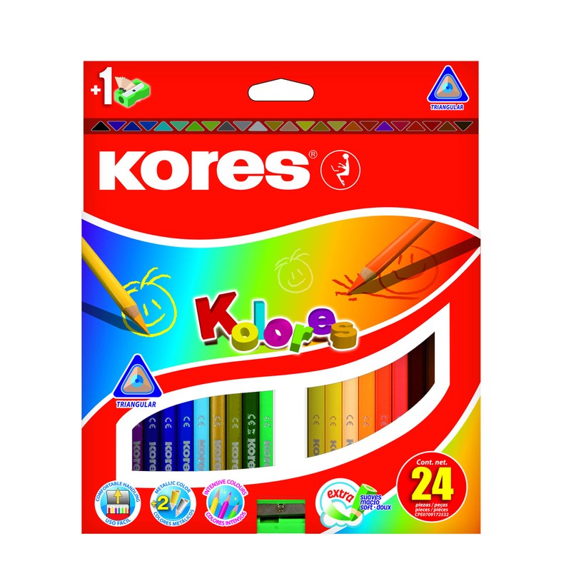 Kores Kolores are high quality triangular coloured pencils with super soft and extra smooth lead of 2.9mm. The lead contains extra colour pigments to provide intense and vibrant colours, which is perfect for all colouring needs. Kolores pencils do not contain rainforest wood and fulfill European regulation EN71, parts 1, 2, 3 and 9 (safety requirements for toys). They are made of carefully selected soft wood. Each pencils is lacquered in the lead colour for easy identification. The full length of the lead is glued to the wood casing of a pencil, which prevents breakage. Break-resistant lead and high-quality wood ensure easy sharpening. Lead thickness: 2.9mm. The ergonomic triangular shape ensures relaxed and comfortable colouring. Each pencil has a namefield (a space to put a kid's name) on one of the edges. The box includes 24 pencils in bright assorted colours. Usage recommendation: apply with varying pressure to paper for different color intensity; keep pencil well sharpened for clear lines.