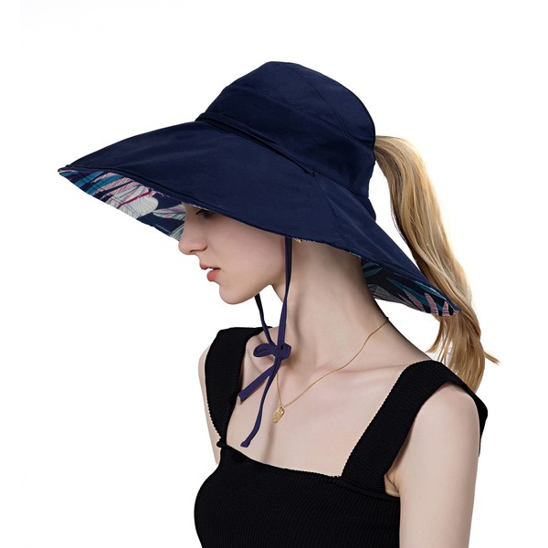 Koreshion - Sombrero de pesca reversible para mujer, con lazo plegable, para verano, UPF 50+, gorra de playa de ala ancha, marino, Talla única