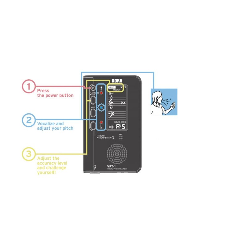 - The VPT-1 is an easy to use, hand held Vocal Pitch Trainer designed by KORG specifically for the human voice to improve and help singing in perfect pitch. Ideal for all singers of all genres and all levels of expertise