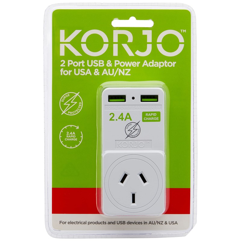 Korjo US USB Adaptor Australia, 2X USB Sockets, 1x AUS/NZ Socket, for USA, America, Canada, White