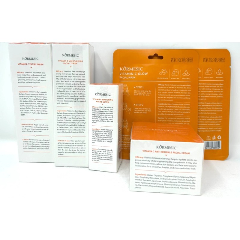 KORMESIC 6PC Vitamin C Facial Set, (Cleanser, Toner, Serum, Cream, & 2 Masks)