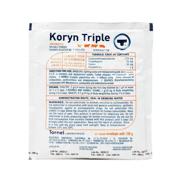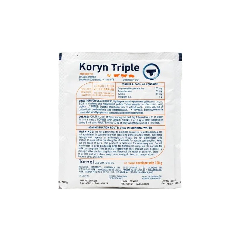 Koryn Triple Oral 100 Gr es un tratamiento para infecciones de vías respiratorias como coriza, laringitis, sinusitis, neumonías y bronquitis agudas y crónicas. Indicado para enfermedades genitourinarias incluyendo uretritis, cistitis, vaginitis, pielonefritis y metritis. Apto para afecciones del aparato digestivo como disentería, colibacilosis, gastroenteritis y diarreas de diversas causas. En cerdos, se utiliza para la disentería, la erisipela y la artritis por Mycoplasma. En aves, incluyendo pollos, pollitas de reemplazo y gallos de combate, es efectivo contra el coriza, cólera aviar, estafilococosis, enfermedad crónica respiratoria (ECR), Mycoplasma gallisepticum y M. synoviae; y para la sinusitis en pavos. En bovinos, se emplea contra la pasteurelosis, estreptococosis, bronconeumonías complicadas con micoplasmas y enfermedades enterobacterianas, además de otitis.