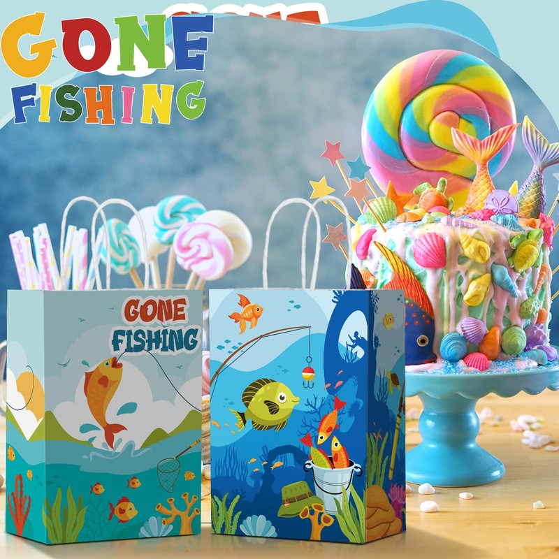 - Fishing Theme Design: the vibrant and intriguing design of the fishing paper bags, printed with the text [Gone Fishing], [Catch Of The Day], and many cute fish, fishing rod, boat patterns; These are designed with a real visual flair, coordinate these candy bags with other party supplies to create an eye-catching color scheme
