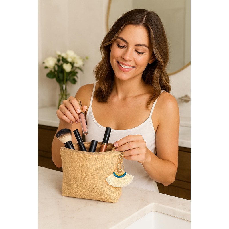 Kosmetiktasche für Damen, Make-up-Organizer, 100 % Baumwolle und Jute, Unisex, Beige, Natürliche Jute, Lässig mit dekorativer Quaste