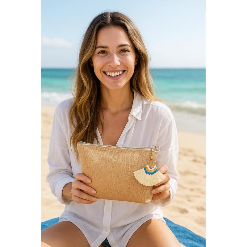 - Unauffällige Dekoration: Die Make-up-Tasche mit ihrem originellen Design aus natürlichem Jutegewebe und Schlüsselring mit Fransen in Rot oder Beige am Reißverschluss und ihrem wasserdichten Innenfutter hat ein sehr originelles Design und bricht mit der üblichen Ästhetik der typischen Make-up-Tasche und unterscheidet sich durch ihre attraktive rote Farbe oder natürliche beige Jute im originellen ethnischen Design. dekorativer Bommel in rot Beige mit mehrfarbigen Details und goldenen Oberflächen