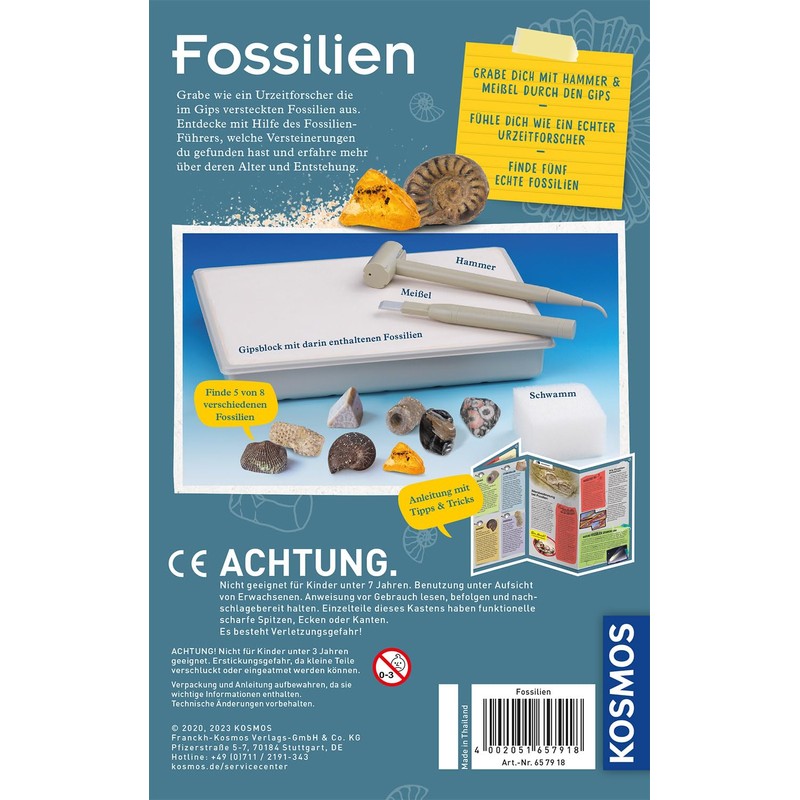 Einfach unglaublich, dass sich echte Fossilien, wie Ammonit, Steinkoralle, Atrypa-Schale, Copal in diesem Gips-Ausgrabungsblock von KOSMOS verstecken. Mit Hammer und Meißel graben sich kleine Urzeit-ForscherInnen behutsam durch die unterschiedlichen Gipsschichten. Das geht ganz einfach mit der Anleitung: Sie erklärt den Kindern, wie sie bei ihren Erkundungen am besten vorgehen und beantwortet viele Fragen, die beim Spielen rund um das Thema Fossilien entstehen. Die tollen Fossilien-Funde sollen natürlich auch Freunde, Geschwister und Eltern bewundern!