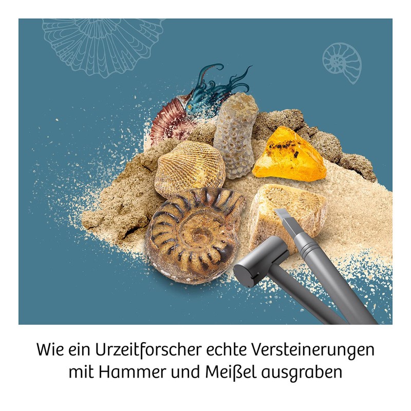 - Graben, entdecken, staunen – einfach unglaublich, dass sich echte Fossilien, wie Ammonit, Steinkoralle, Atrypa-Schale oder Copal in diesem Gips-Ausgrabungsblock verstecken