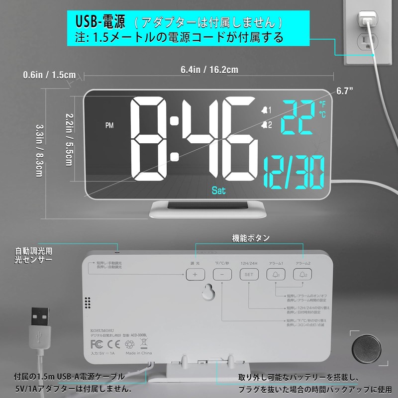 - [6.7 Inch White Alarm Clock] This stylish LED clock features a mirror clock style 6.7 inch display, dual alarm, 12/24 hour format, date, day, second, temperature (℉/℃), auto/manual dimming, beautiful digital calendar and cute alarm clock for bedroom with white and sky blue numbers. In addition, the bright and large white and sky blue numbers make the desktop watch cool and easy to read