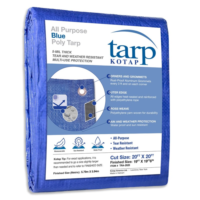 Kotap TRA-2020 Waterproof All-Purpose Multi-Use Protection/Coverage 5-mil Poly Tarp, Cut Size: 20 x 20'/Finished Size: 19' X 19' 6", Blue
