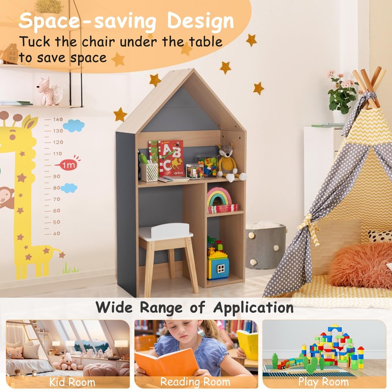 The house-shaped design of this children's writing desk adds a touch of charm and creativity to any space. Whether they are drawing, studying, or reading, this kid-sized desk and chair set will be their constant companion, fostering a love for learning and promoting organization skills. Equipped with a blackboard on the side, this desk allows children to express their creativity to the fullest.
