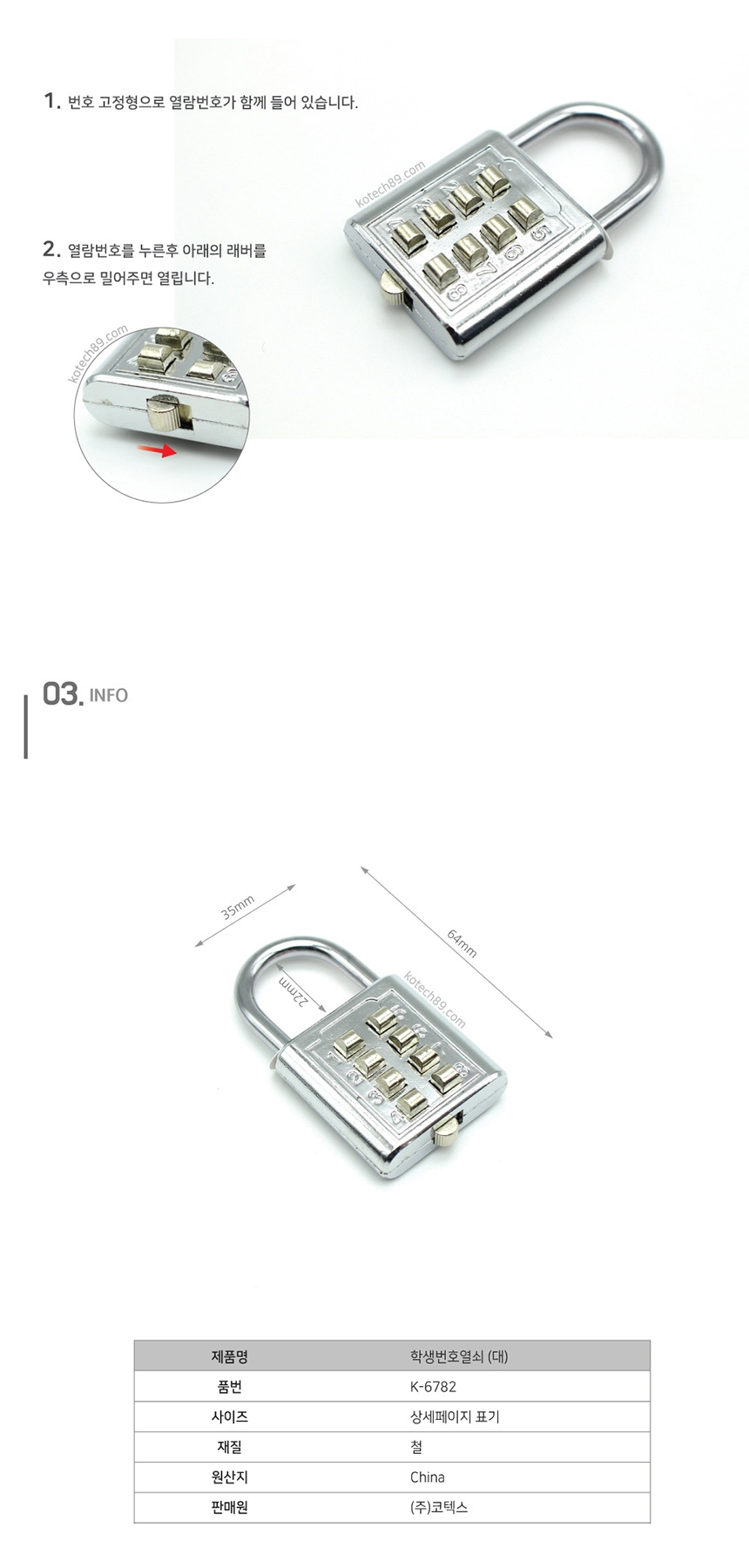 Kotek Keyed Hanging Padlock, Student Number 6782 (Large) Hardware 2ea
