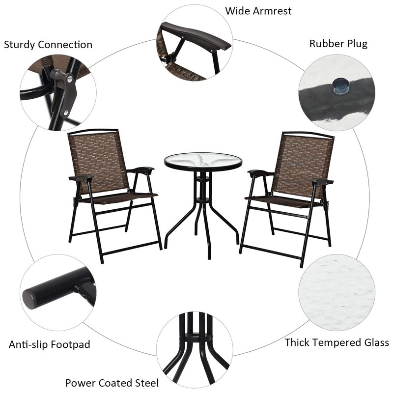 - 【Easy Assembly and Maintain】No assembly is required for the chairs. You just need to simply unfold the chairs and assemble the table with our clear instructions. And with the water-proof material and the tempered glass tabletop, this 3pc bistro set is easy to clean.