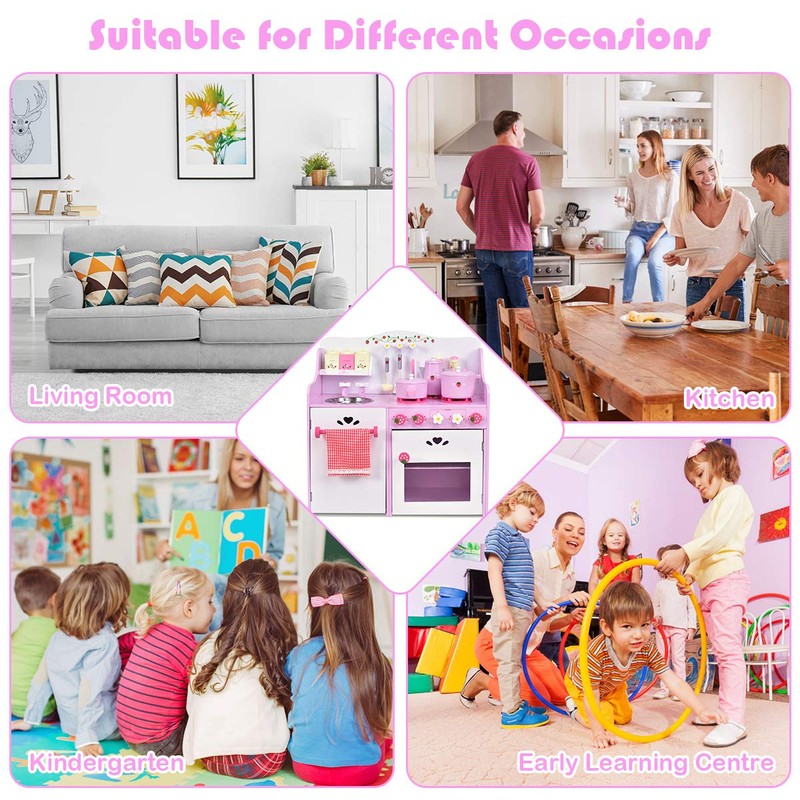 - 🌸【Adorable Appearance, Great Gift Choice】🎁The color of this kid kitchen play set is pink+white with strawberries and flowers patterns for decoration. It’s a perfect present for birthday, Christmas, Halloween, Thanksgiving, New Year and role play enthusiasts. In addition, freestanding design is ideal for playroom, bedrooms, daycare and classrooms.