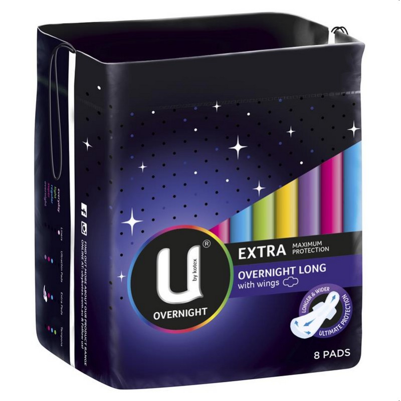 U by Kotex Extra Overnight Long Pads provide mega protection that hugs your body for ultimate comfort. Overnight Long Pads are even longer, and over 25% wider at the back for maximum protection, so you can enjoy that beauty snooze without a worry, because your dreams don't stop when your period starts.