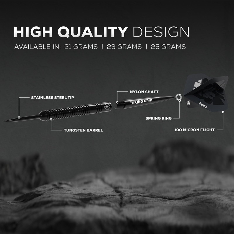 - Steel tip dart: 25 g with barrels made from 90% tungsten with black steel tips. Each set has 3 darts with 6 pieces of KOTO flights and 2 sets of KOTO shafts (short and medium) and a KOTO wallet.