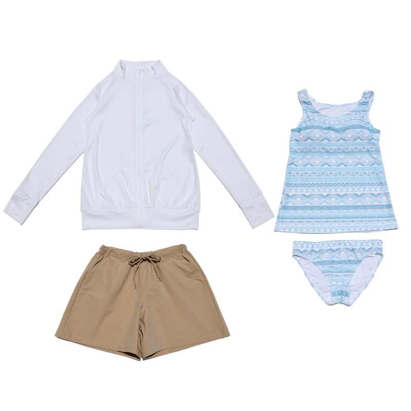- まず、セット内容は充実の4点。エスニックボーダーが施されたタンキニ、長袖のスタンドパーカー、ブラトップ、そしてショーツのショートパンツの組み合わせで、シーンに応じた多彩な着こなしが楽しめます。エスニックボーダーのデザインはトレンド感があり、個性的でありながら、落ち着いた雰囲気を醸し出しております。周囲の目を気にすることなく、リラックスした気分でビーチやプールを楽しむことができるでしょう。