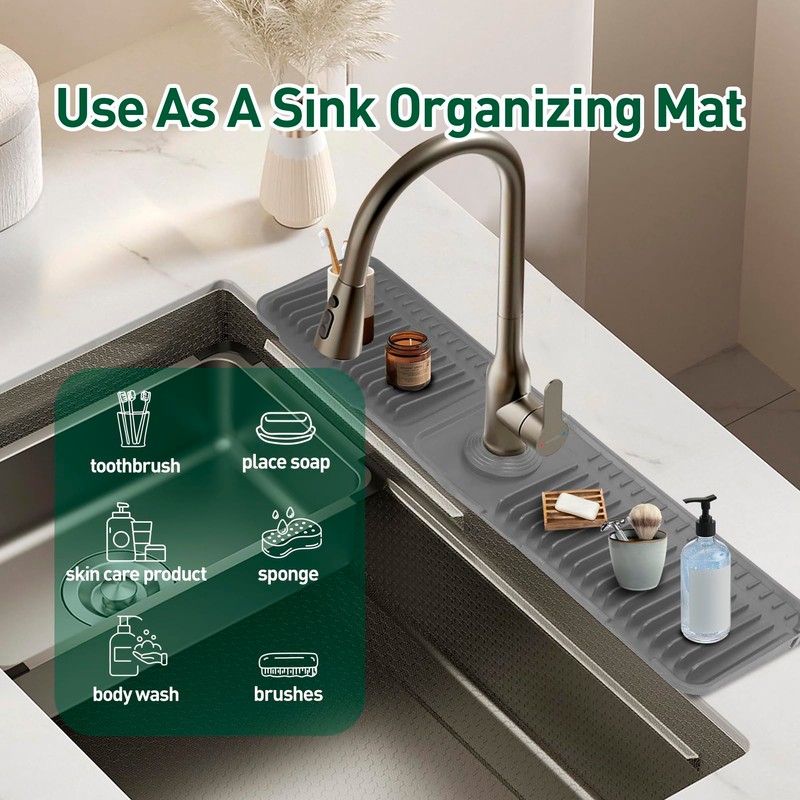 - 【Silicone Faucet Mat And Easy To Clean】Our silicone faucet mat is soft and durable, won't scratch your utensils, totally safe to use. You can rinse the silicone splash pad with running water or dishwasher after multiple uses, and the splash pad will looks like new, perfectly suit modern kitchen style.