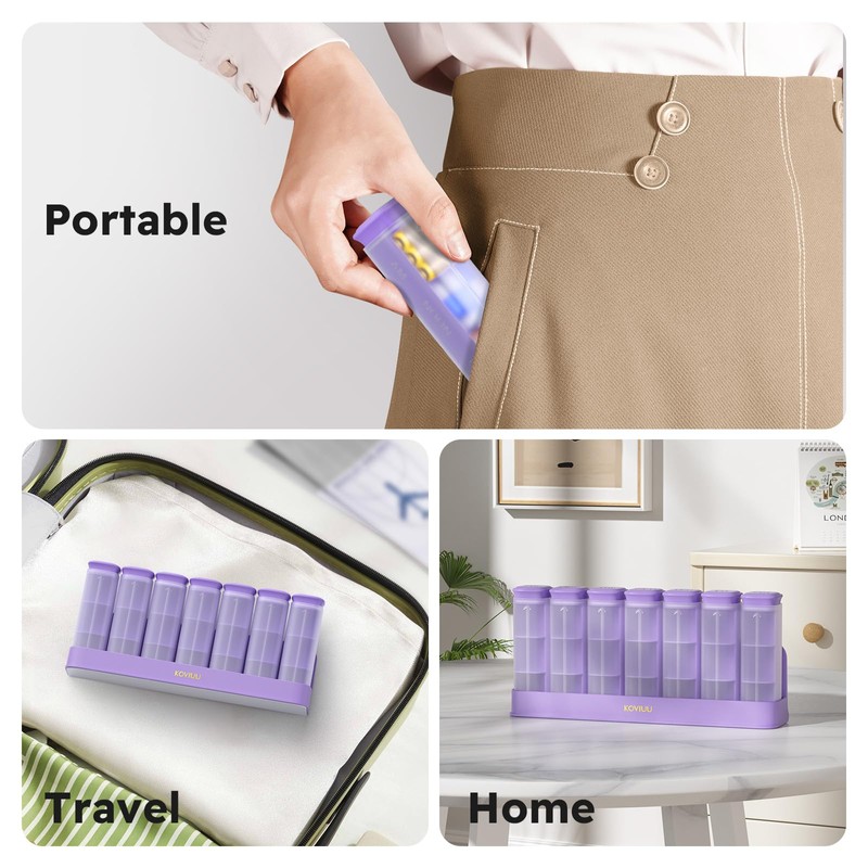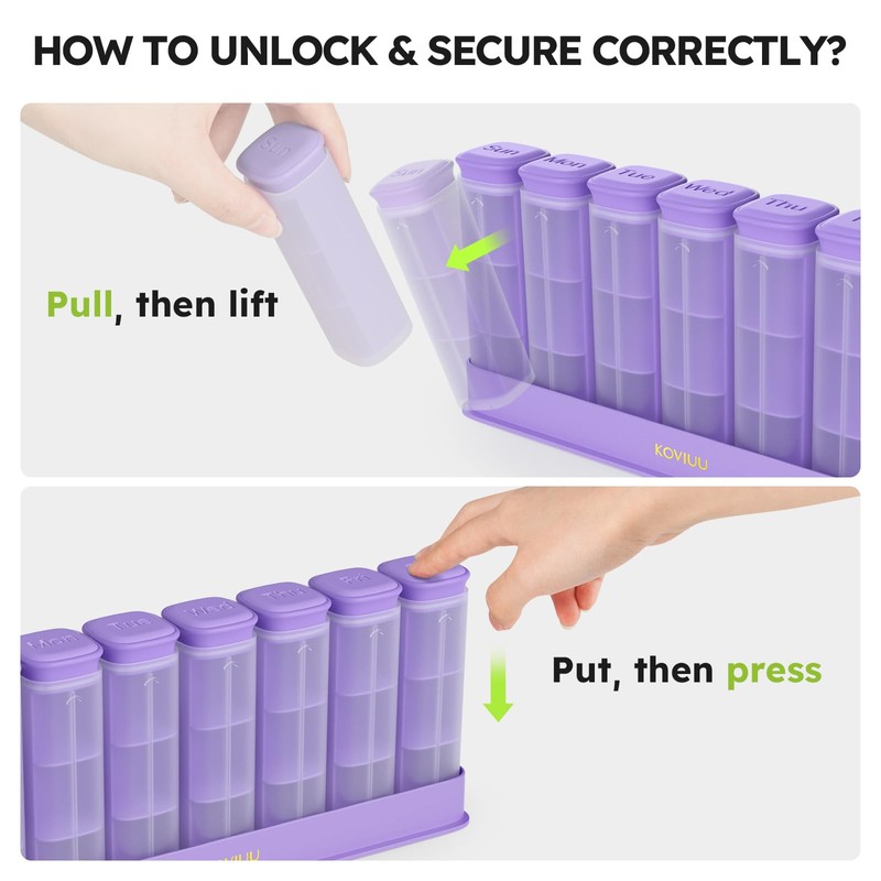 - Drawer Design: KOVIUU newly presents a drawer-style pill organizer 7 day that stays securely closed once shut, ensuring pills do not spill out in pockets & bags while you can easily pull out the inner tube to access your pills