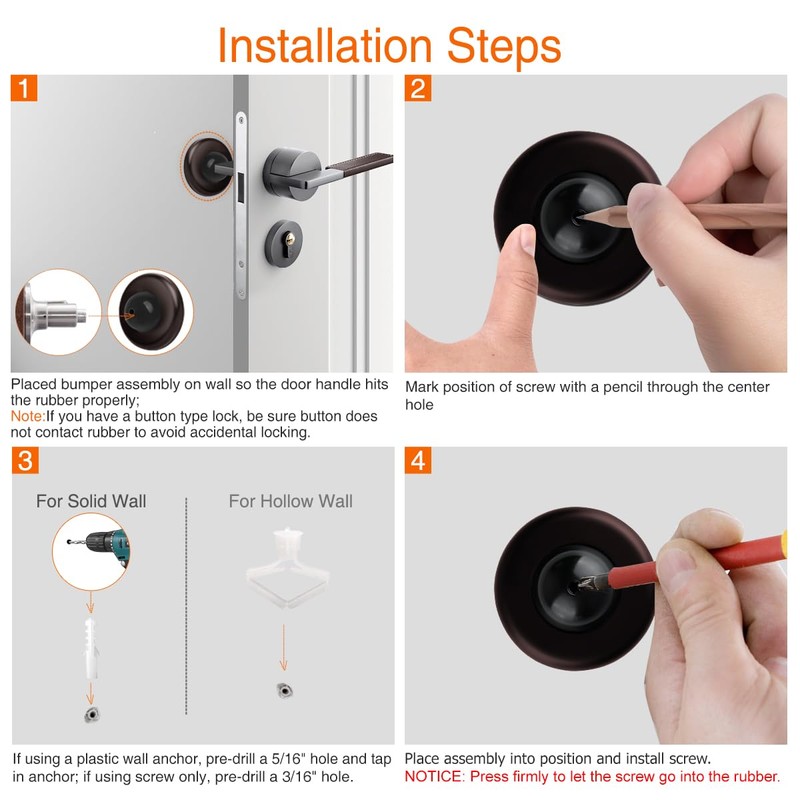 - EASY INSTALL & NEVER FALLING OFF - Our door knob wall protector come with the necessary parts for installation, installation won't take more than 3 minutes. Wall stopper is fixed to the wall by screws firmly, so you will never worry about it falling off.