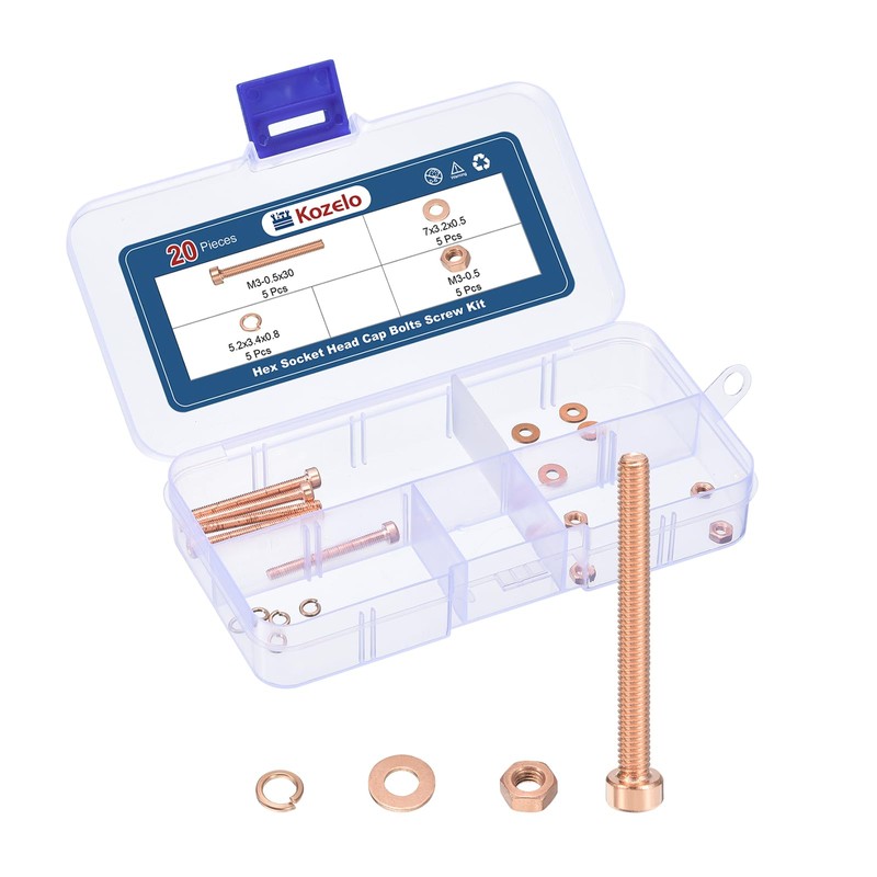 Kozelo 20pcs M3 Socket Head Cap Screws Bolts Nuts Assortment Kit - [M3-0.5x30mm] Red Copper Fully Threaded Hex Screw for 3D Printer Use